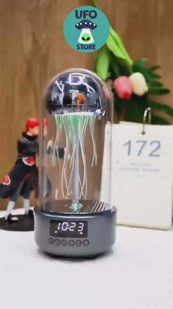 Una lámpara, múltiples funciones. Esta lámpara de mesa estilo medusa no solo ilumina tu espacio con colores vibrantes, también integra parlante Bluetooth, reloj digital y reproductor de audio desde USB, Micro SD y entrada Auxiliar.